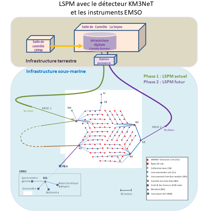 The plateform was initiated through the MEUST/NUMerEnv subsea insfrastructure (MEUST), and hosts the French site of the international KM3NeT experiment. It also represents the West-Ligure node of EMSO for environmental studies conducted by the Technical Division of the National Institute of Sciences of the Universe (DT-INSU) of the CNRS, the Mediterranean Institute of Oceanology (MIO), the Computer and Systems Laboratory (LIS) and Géoazur. LSPM is the second generation of submarine infrastructure, after the one deployed in the framework of the ANTARES experiment.