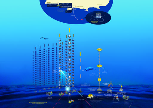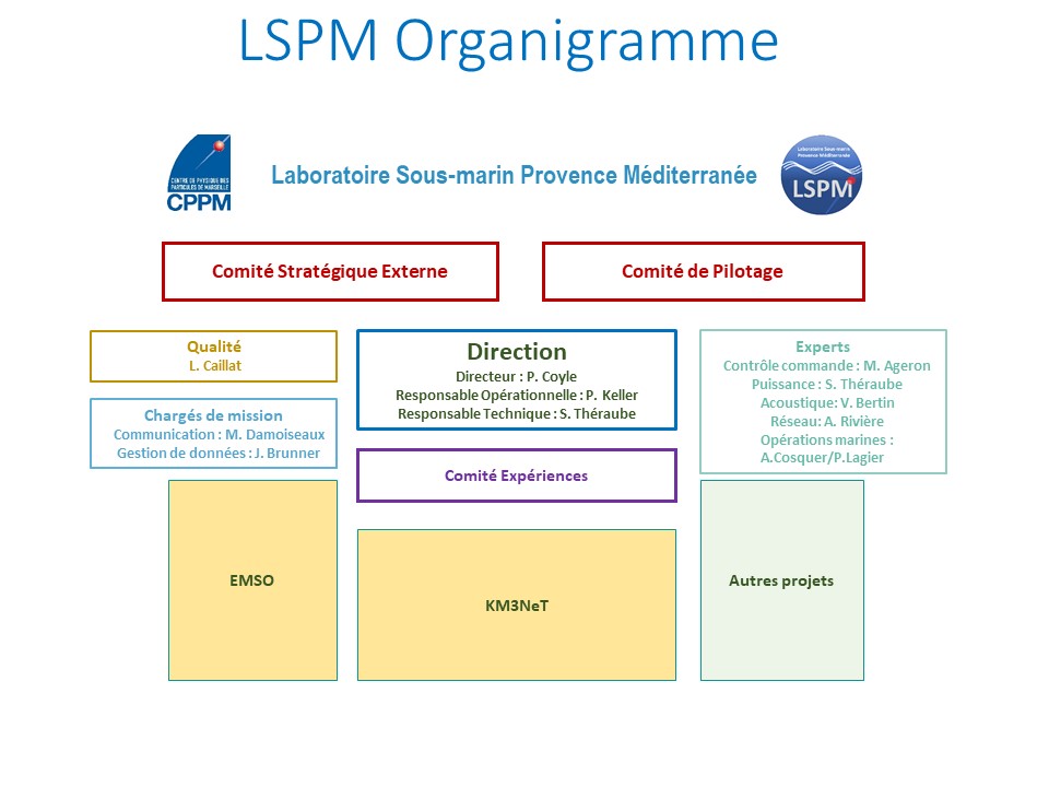 The Laboratoire Sous-marin Provence Méditerranée (LSPM) is a national plateform of CNRS's National Institute of Nuclear and Particle Physics (LSPM, CNRS UAR2032 unit). LSPM has been labelled "Aix-Marseille Plateform" in order to structure the offer of skills and to make it easily accessible to the socio-economic and academic world. Aix-Marseille University and Ifremer participate in the piloting of this infrastructure oriented towards multidisciplinary research and scientific culture. CPPM is the host laboratory for this platform, consisting essentially of an underwater infrastructure, installed at a depth of 2,450 meters, 40 kilometers south of Toulon, with real-time data transmission from the various instruments to the control rooms on land (La Seyne-sur-Mer, Marseille). The LSPM platform hosts the KM3NeT ORCA neutrino detector and EMSO environmental sensors. Other underwater connection links are available for new users.
