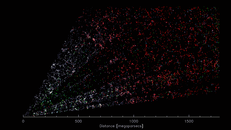 Mais cette productivité exige un contrôle incroyablement détaillé de chacun des 5000 robots de pointe qui positionnent les fibres optiques sur l'instrument, en veillant à ce que leurs positions soient précises à 10 microns près, soit moins que l'épaisseur d'un cheveu humain. Ce niveau de précision est nécessaire pour accomplir la tâche principale du relevé : collecter les spectres de millions de galaxies sur plus d'un tiers du ciel entier. En général, plus le spectre d'une galaxie est décalé vers le rouge, plus la galaxie est éloignée. Avec une carte 3D du cosmos en main, les physiciens peuvent cartographier les amas, les superamas de galaxies et les vides cosmiques. Ces structures portent l’empreinte de leur formation initiale, lorsqu'elles n'étaient que des ondulations dans le cosmos naissant. En mesurant cette empreinte, les physiciens peuvent utiliser les données de DESI pour déterminer l'histoire de l'expansion de l'Univers.