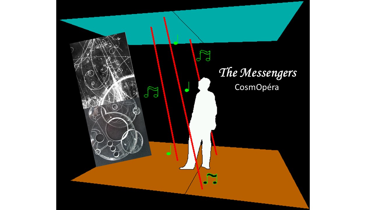 Le CosmOpéra "The Messengers" (Les Messagers) réunit les concepts du Cosmophone http://cosmophone.in2p3.fr/ et de FutureCoast http://futurecoast.org/. FutureCoast a collecté sur le web des messages hypothétiques issus du futur associés au changement climatique, matérialisés sous forme de "chronofacts". Le Cosmophone est une installation immersive de détection et restitution sonore en temps réel des rayons cosmiques ambiants. Le CosmOpéra restitue les "chronofacts" choisis par le public sous la forme d’événements musicaux pilotés par les rayons cosmiques, les Messagers.